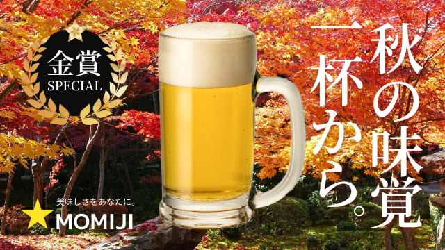 紅葉とビールの組み合わせで季節の豊かさと味覚の魅力を表現し、「秋の味覚、一杯から。」というコピーで落ち着いた贅沢感を演出しています。