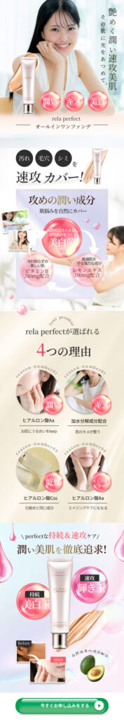 商品名「rela perfect オールインワンファンデーション」を想定し、「潤い」「キメ」「美白」をキーワードに、上品で信頼感のあるビジュアルデザインを目指しました。