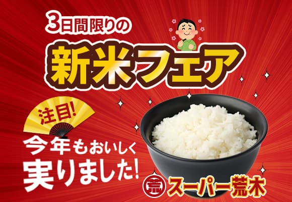 株式会社マイウェブ様よりご依頼を受け、スーパーマーケット「スーパー荒木」の店頭イベント「新米フェア」告知バナーを制作しました。