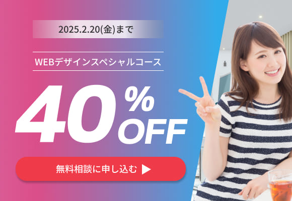 「Webデザインスペシャルコース 40%OFF」をテーマに、シンプルかつ視認性の高い構成で割引内容を一目で伝えるデザインを意識しました。